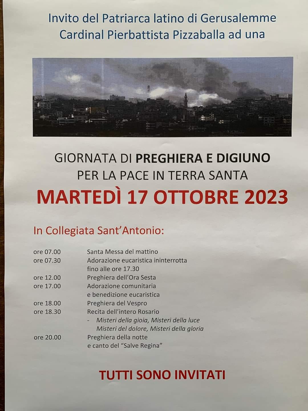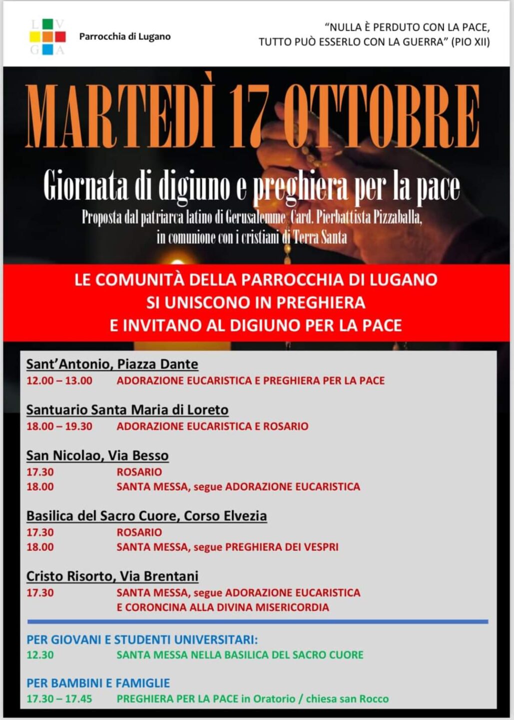 La comunità parrocchiale di Lugano propone una giornata di digiuno e di preghiera . In alcune chiese della città saranno proposte diversi momenti di preghiera, per chiedere che si fermino le armi del recente conflitto che ha colpito la Terra Santa.