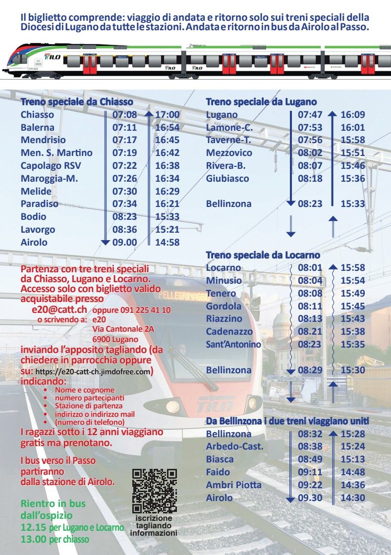 Anche quest’anno, per raggiungere il Gottardo per la festa nazionale, ci sono tre treni speciali in partenza da Chiasso, Lugano e Locarno. Il biglietto dal costo di 15 CHF.- (gratis fino ai 16 anni) è acquistabile in diverse modalità: scrivendo all’indirizzo email e20@catt.ch con i propri dati, telefonando al numero 091 225 41 10, oppure scrivendo per posta all’indirizzo e20, Via Cantonale 2A, 6900 Lugano.