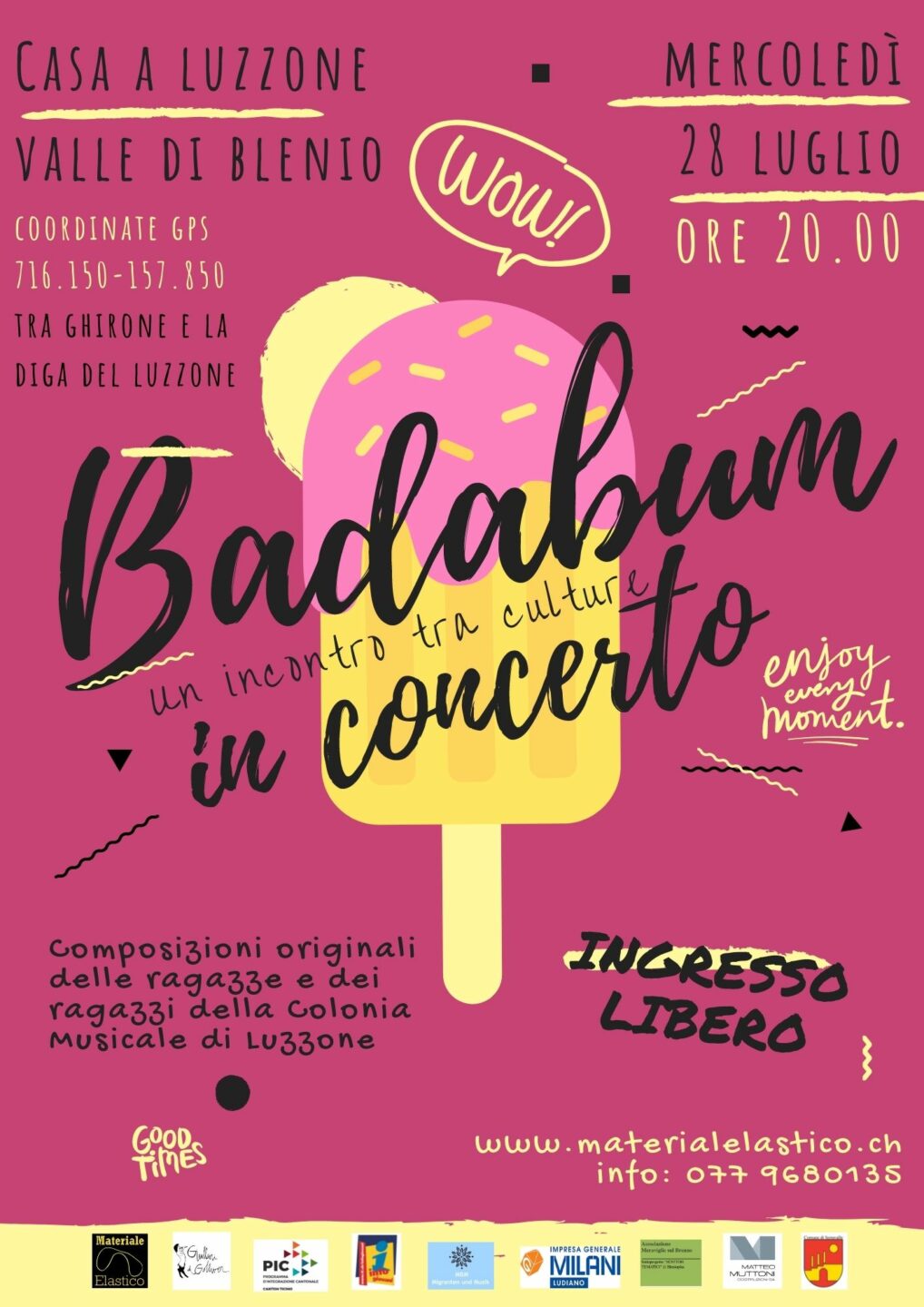 La colonia Badabum è una colonia musicale per adolescenti che integra ragazzi provenienti da tutto il Ticino e rifugiati. Durante i primi dieci giorni di residenza i ragazzi (di età compresa tra i 13 e i 16 anni), affiancati dai monitori e guidati da musicisti professionisti lavorano alla creazione di uno spettacolo musicale. La seconda parte della colonia è dedicata ai concerti in diverse località del Ticino e a momenti di svago.
