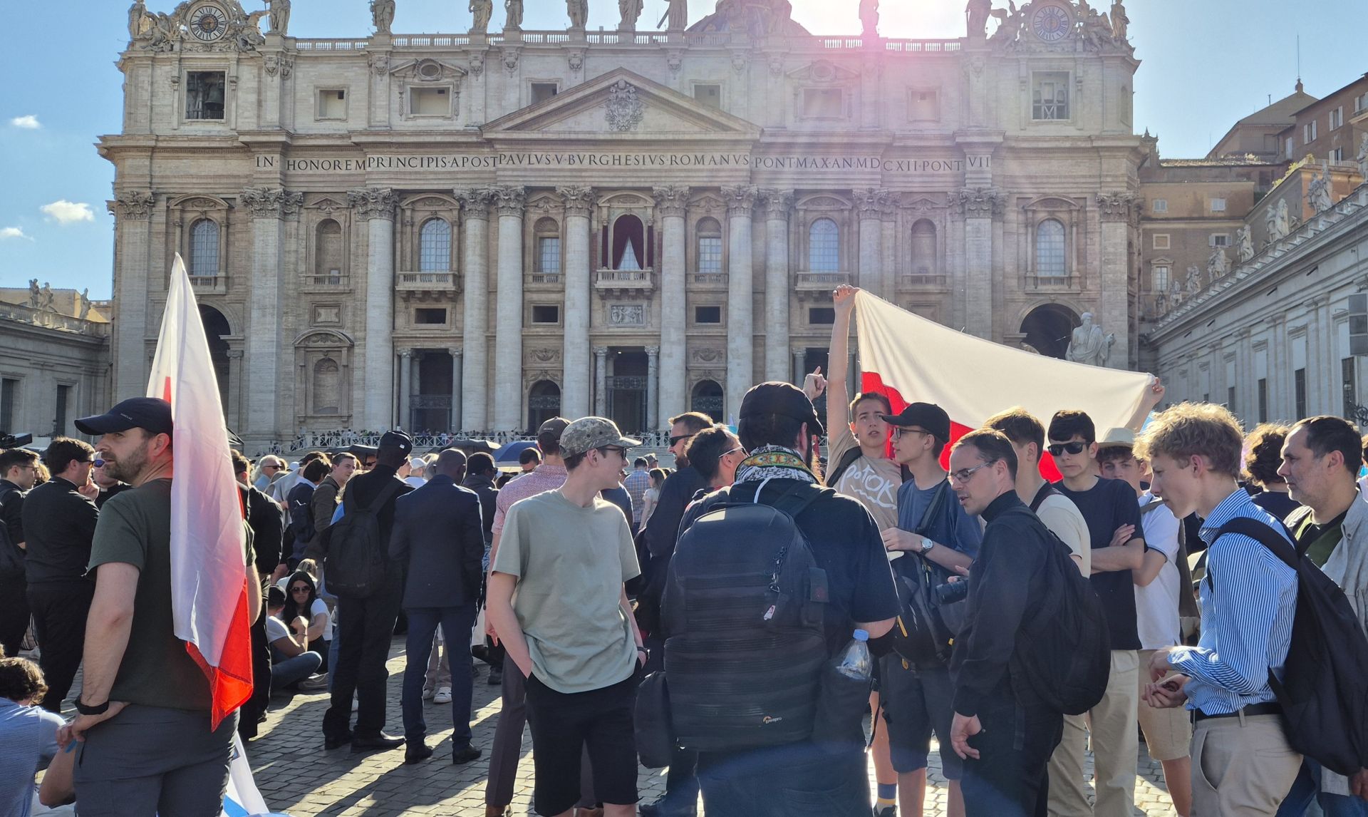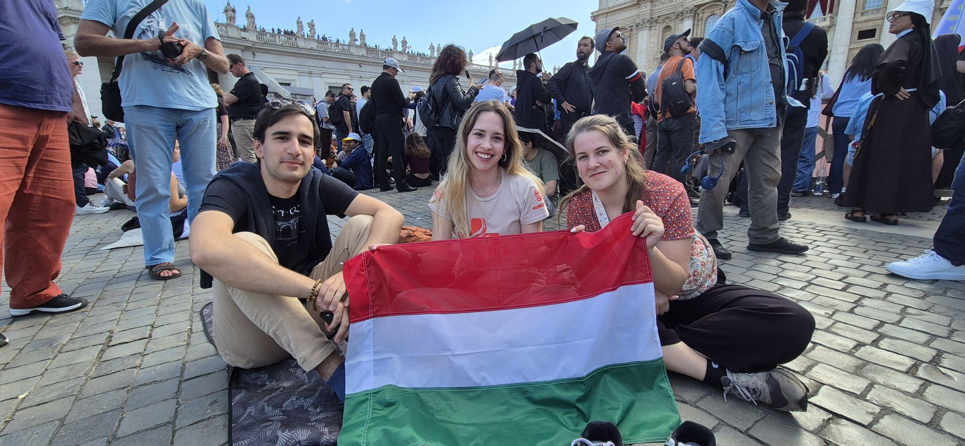 Qualche ora dopo, tra i tanti volti e bandiere che continuano ad affluire in piazza San Pietro, incontro tre giovani ungheresi. Sono qui perché uno di loro sta svolgendo un programma Erasmus a Roma e ha invitato le sue due amiche a vivere insieme questo momento storico. Portano con sé una bandiera magiara, come altri gruppi arrivati in questi giorni per pregare anche per il loro cardinale, Peter Erdo, tra i nomi più citati come possibile successore di Pietro.