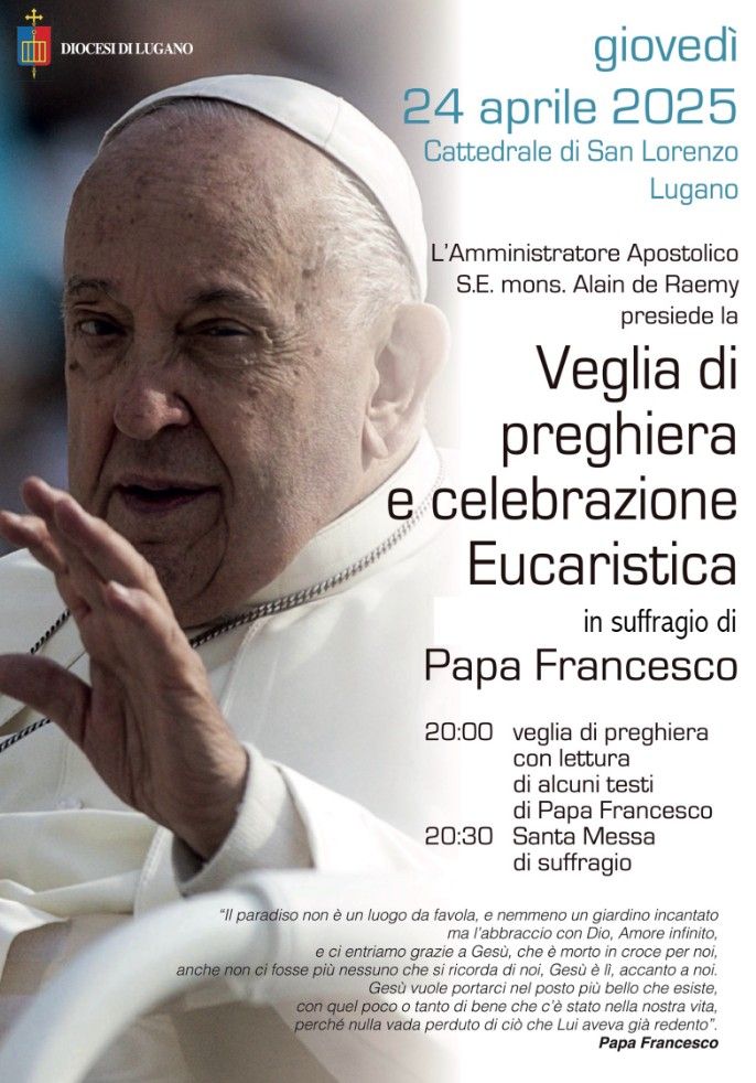 I fedeli della Diocesi di Lugano avranno modo giovedì 24 aprile dalle 20 di vivere in Cattedrale un tempo di suffragio dedicato a papa Francesco. È la Diocesi di Lugano tramite il Centro di Liturgia pastorale a comunicare la notizia. Alle 20 ci sarà una veglia di preghiera con la lettura di testi di papa Francesco, mentre alle 20.30 il vescovo Alain presiederà la funzione eucaristica. Tra le comunicazioni date il Centro di Liturgia pastorale rammenta che presbiteri e diaconi sono invitati a venire muniti della propria stola, il colore liturgico sarà il bianco.