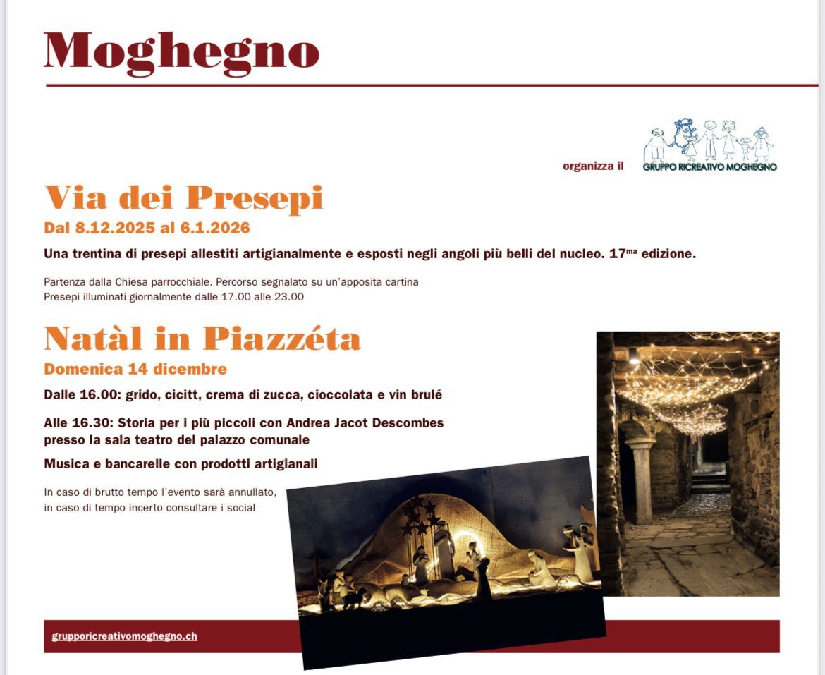 Sono una trentina le natività tutte da scoprire negli angoli più belli del nucleo di Moghegno. L’iniziativa, giunta alla 17esima edizione, «è diventato un appuntamento fisso del periodo natalizio sempre molto apprezzato», ci dice Cristiana Ferrari, del Gruppo ricreativo di Moghegno che ogni anno con grande impegno organizza e promuove questo evento. «C’è sempre molto entusiasmo da parte della popolazione nell’esporre le proprie creazioni, ognuna con il proprio stile. Sono in molti ad annunciarsi, anche fra coloro che qui a Moghegno hanno una casa di vacanza. La mia impressione è che di anno in anno la qualità degli allestimenti si alza. Abbiamo anche migliorato, grazie alla collaborazione con il Comune di Maggia (del quale Moghegno è una frazione, ndr), l’illuminazione del nucleo così da facilitare la visita nelle ore serali». Fin dai primi giorni di apertura l’affluenza è stata alta, a dimostrazione del successo di questa iniziativa. I presepi, da quelli tradizionali ai più moderni e originali, realizzati con materiali diversi, potranno essere ammirati fino al 6 gennaio. Si consiglia di percorrere la «Via dei presepi» partendo dalla chiesa parrocchiale, dove è messa a disposizione un’apposita cartina grazie alla quale orientarsi fra i vari allestimenti. (KG)