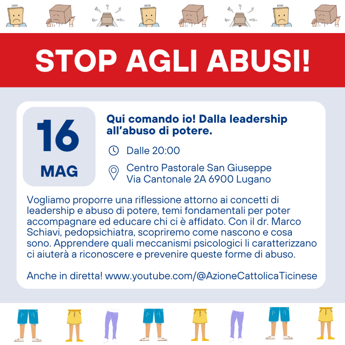 L’Azione Cattolica Ticinese vuole prendere sul serio il rapporto sul progetto pilota degli abusi sessuali nel contesto della Chiesa in Svizzera presentato a Zurigo nel settembre 2023 e per questo propone un percorso di sensibilizzazione rispetto alle tematiche dell’abuso (sessuale e di potere) rivolto a tutti gli educatori. «Il percorso ha quattro obiettivi – spiega Lara Allegri, presidente dell’Azione Cattolica Ticinese – che sono: sensibilizzare alla tematica dell’abuso nelle diverse forme; abbattere eventuali tabù relativi alla sessualità; imparare a riconoscere gli indicatori e sapere come procedere e allestire appunto delle linee guida specifiche per l’associazione».