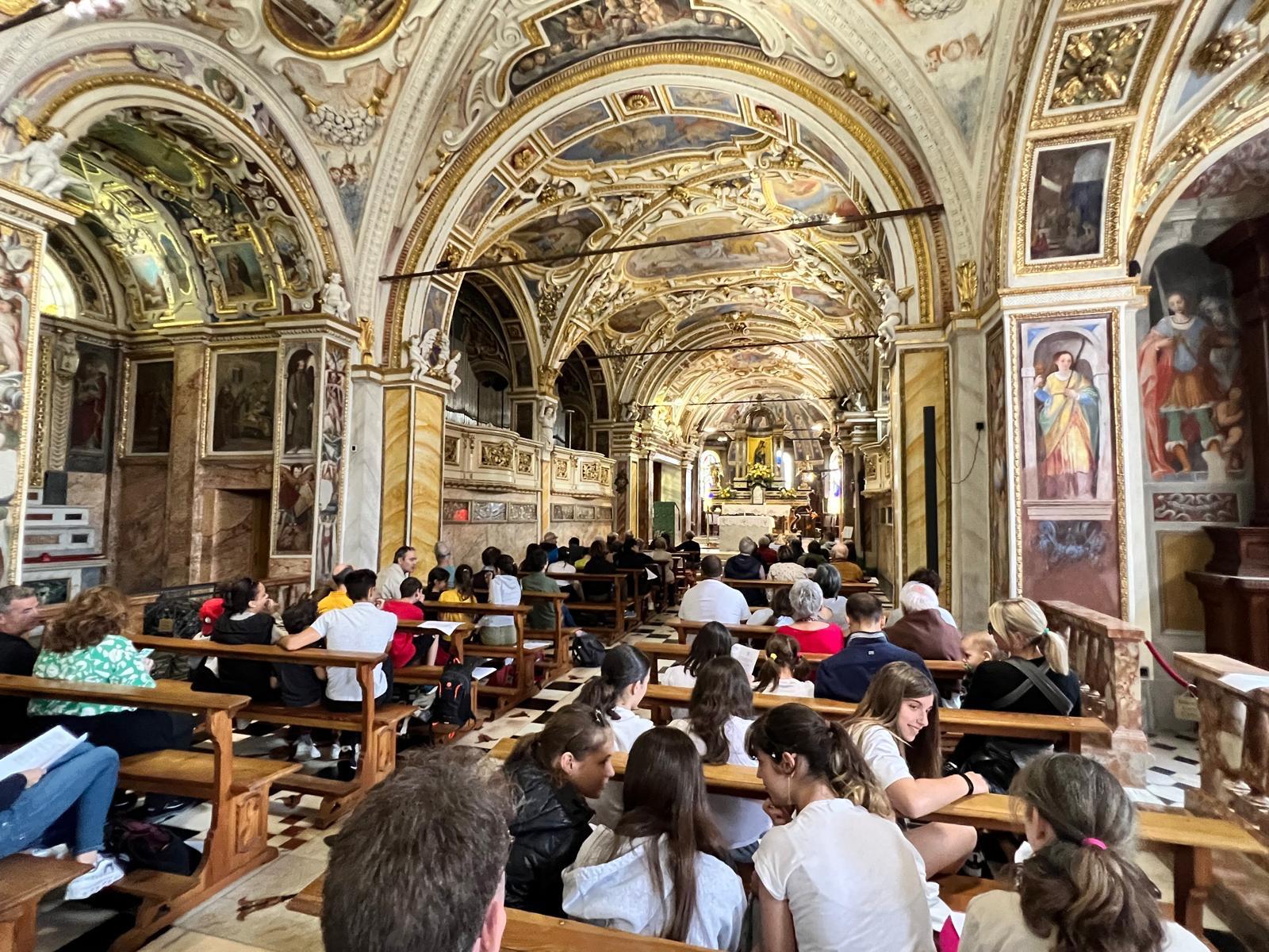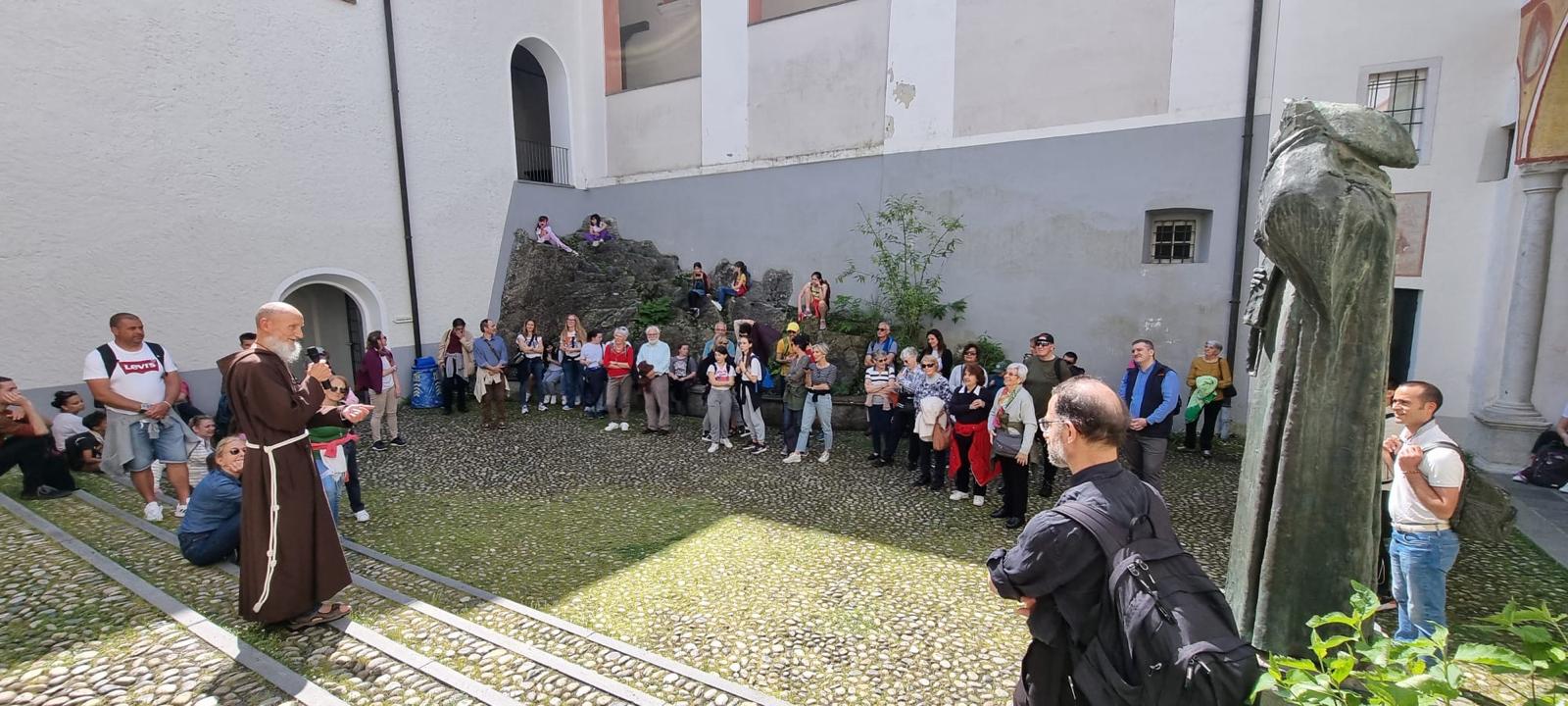 Al Santuario ci ha accolto Padre Agostino, guardiano della Madonna del Sasso, che ci ha raccontato la storia del luogo e i suoi tesori. Uomo gioviale e colto, ha subito adattato il registro alla presenza di una trentina tra bimbi e ragazzi. Così, affascinati dalla narrazione incisiva e sintetica, abbiamo appreso che il Santuario, uno dei luoghi storici e religiosi più importanti del Cantone, è stato fondato a seguito dell’apparizione della Vergine al francescano Bartolomeo da Ivrea. Padre Agostino ci ha suggerito di non mancare la visita di tre grandiose opere d’arte qui custodite : la statua della Madonna del Sasso, la pala della Fuga in Egitto del Bramantino e il Trasporto di Cristo al sepolcro del ticinese Antonio Ciseri. Ma ci siamo commossi anche davanti ai numerosi ex voto, che esprimono la gratitudine per l’aiuto ricevuto in situazioni difficili, e siamo rimasti incantati dalla vista spettacolare sulla città che si gode da questo luogo, costruito su uno sperone di roccia.