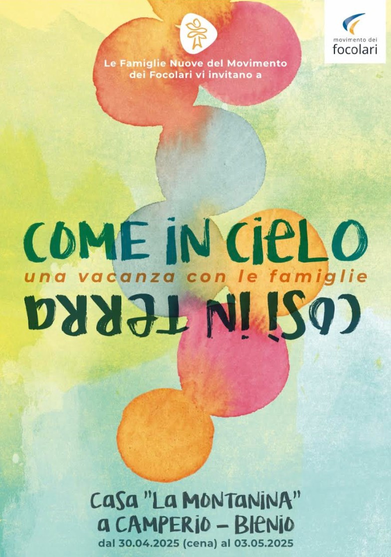 “Come in cielo così in terra”: è l’invito che le Famiglie Nuove del Movimento dei Focolari propongono da mercoledì 30 aprile a sabato 3 maggio, nell’accogliente cornice della Valle di Blenio, presso la casa di vacanza “La Montanina” di Camperio.